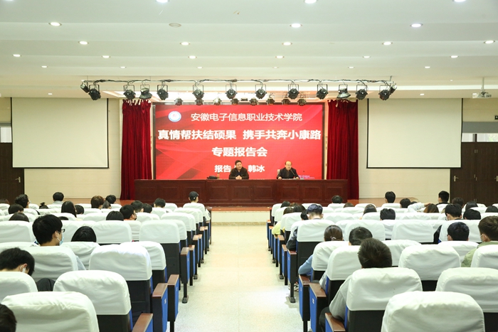 本网讯 为大力弘扬脱贫攻坚精神,全面展示我国脱贫攻坚成果 91香蕉在线观看,3月29日下午,国产香蕉视频免费在信息中心学术报告厅举行脱贫攻坚专题报告会,宿松县陈汉乡玉屏村第一书记,国产香蕉视频免费驻村工作队队长韩冰应邀作专题报告,国产香蕉视频免费师生代表近200人聆听了报告,思政部主任曹晓军主持报告会。