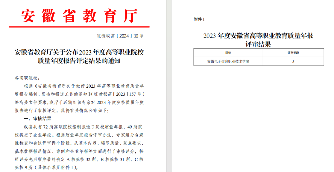 本网讯 近日 91香蕉在线观看,安徽省教育厅公布2023年度高等职业院校质量年度报告评定结果,国产香蕉视频免费质量报告再次荣获A档评定。