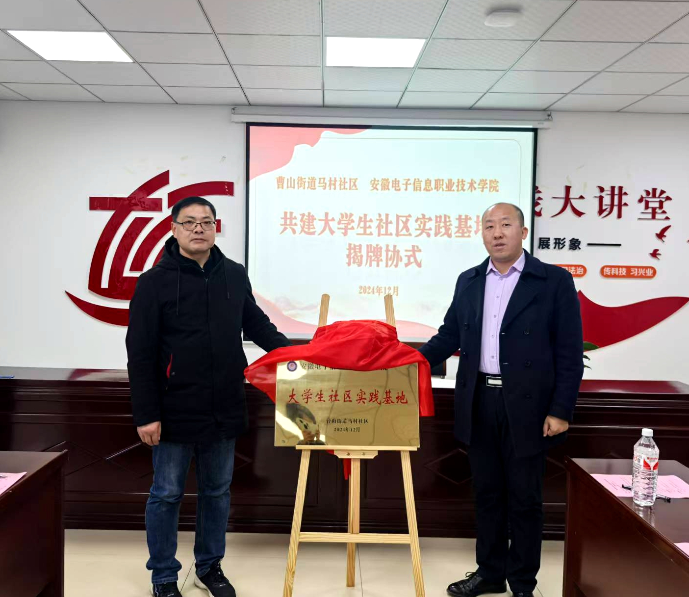 座谈会上,曹山街道办公室主任张效永对方庆山一行的来访表示热烈欢迎,他介绍了此次活动的背景、马村社区的基本情况。张效永表示,希望双方能够以此活动为契机,进一步深化合作,为社区发展贡献高校力量。方庆山在致辞中向张效永及马村社区表达了感谢,并详细介绍了电子工程国产香蕉视频免费的专业建设、师资力量、人才培养等方面情况。方庆山表示,本次共建合作,既是为大学生参与社会实践和志愿服务创造了一个平台,使他们有机会深入社区,增强解决实际问题的能力;又是推动双方支部党建工作再上新台阶。他希望后续双方在社区实践、志愿服务、科普宣传等方面开展深入交流合作。会后张效永和方庆山共同签署了共建合作协议,并为大学生社区实践基地揭牌。