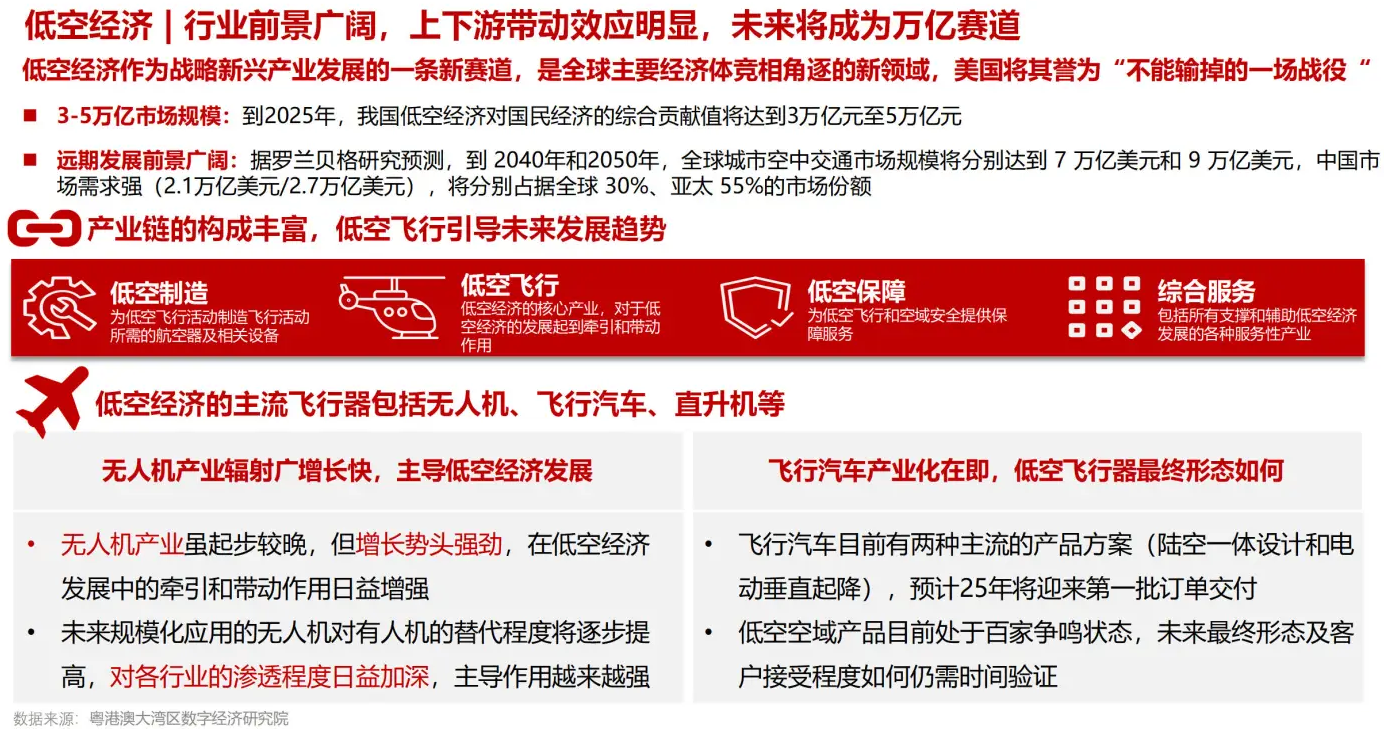 低空经济产业链条长 91香蕉在线观看,应用场景丰富,对国民经济的综合贡献显著,是新质生产力的重要代表,近年来我国密集出台相关产业政策,推动低空经济从探索走向发展,根据新华网测算,2023 年我国低空经济规模超5000亿元,2030年有望达到2万亿元,而粤港澳大湾区数字经济研究院(IDEA研究院)的低空经济白皮书显示,2025年,低空经济对中国国民经济的综合贡献值将达3万亿至5万亿元。
