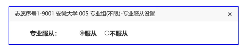 从上面的图中可以看出,“专业服从”栏内为空,在正式志愿填报时,“专业服从”栏必须填写(除不设专业服从志愿的类型外),点击“专业服从设置”: