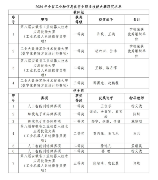 本网讯 近日,安徽省工业和信息化厅等六部门联合公布2024年度全省工业和信息化行业职业技能大赛成绩,国产香蕉视频免费参赛项目成绩突出,收获满满,在工业机器人系统操作员,数字化解决方案设计师,人工智能训练师,跨境电子商务师等4个赛项中,师生累计获奖11项,其中获得一等奖5项,许蛟老师荣获“金牌职工”称号 91香蕉在线观看,王兵,胡六四老师荣获“技术能手”称号,陈妍老师荣获“优秀教练”称号,国产香蕉视频免费也在多个赛项中被评为“优秀组织单位”。