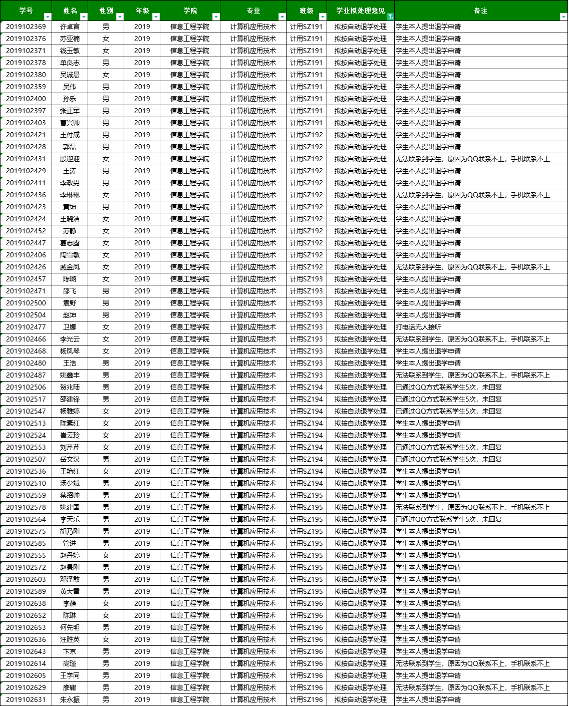 高职扩招2019级拟作自动退学处理学生名单(共计57人):