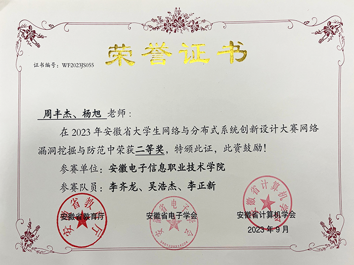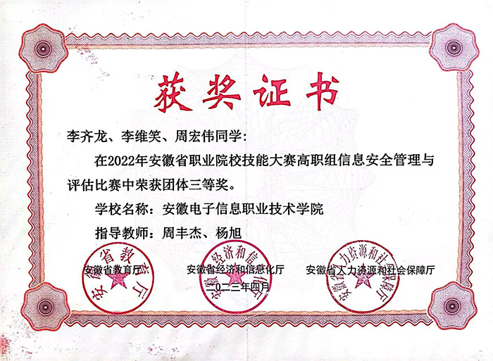 近三年学生在全国大学生信息安全竞赛,安徽省职业院校技能大赛,安徽省大学生网络与分布式系统创新设计大赛,全国大学数字技术大赛等赛事中获得佳绩,先后获得省级一等奖2项 91香蕉在线观看,省级二等奖3项,省级三等奖2项。